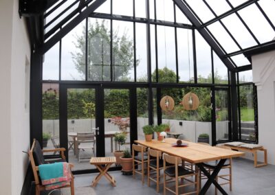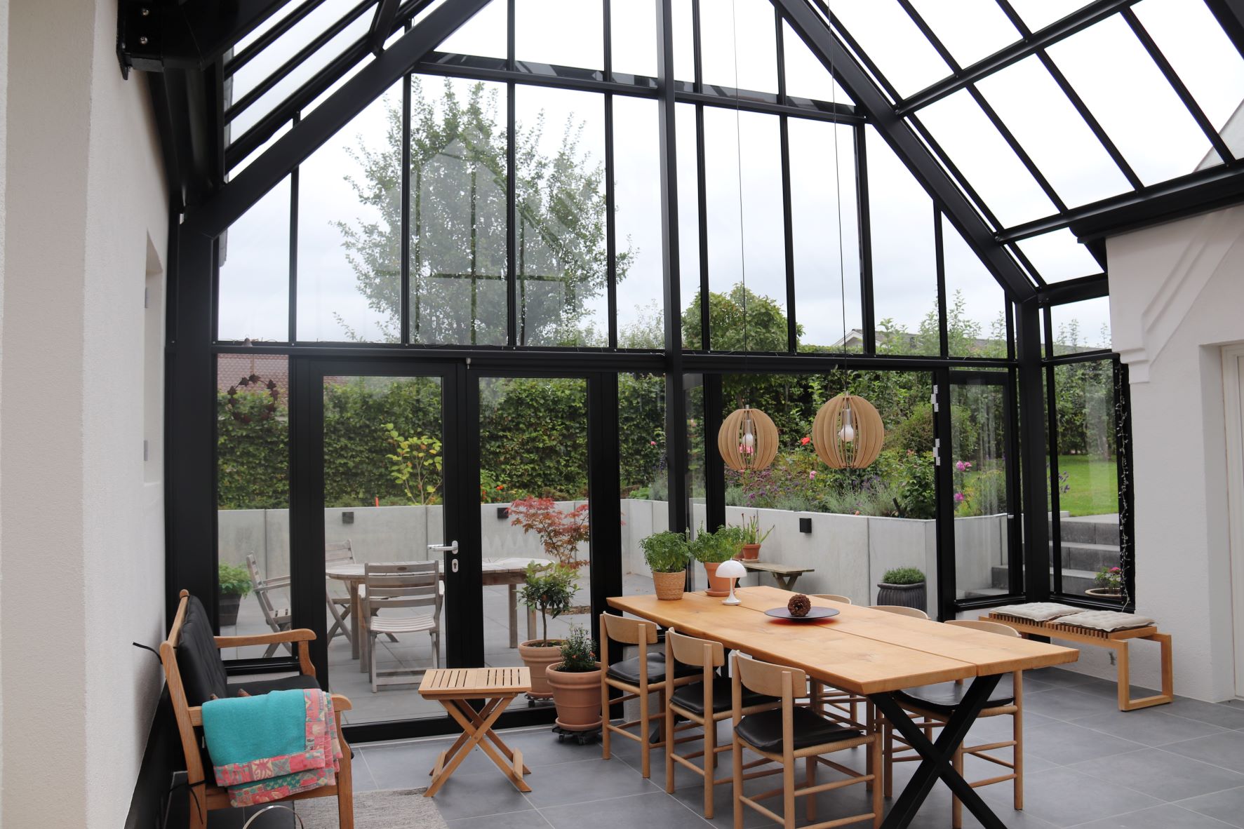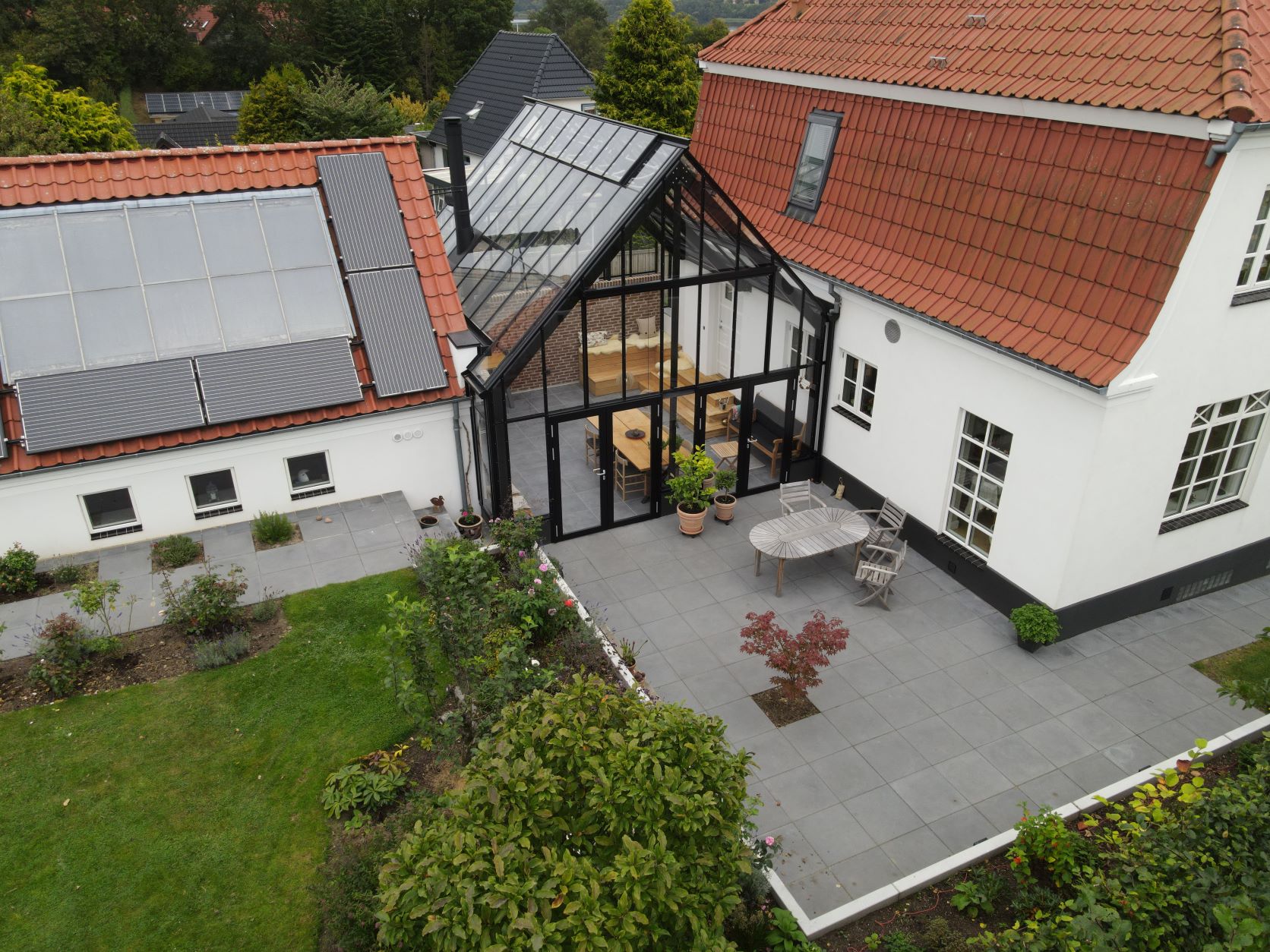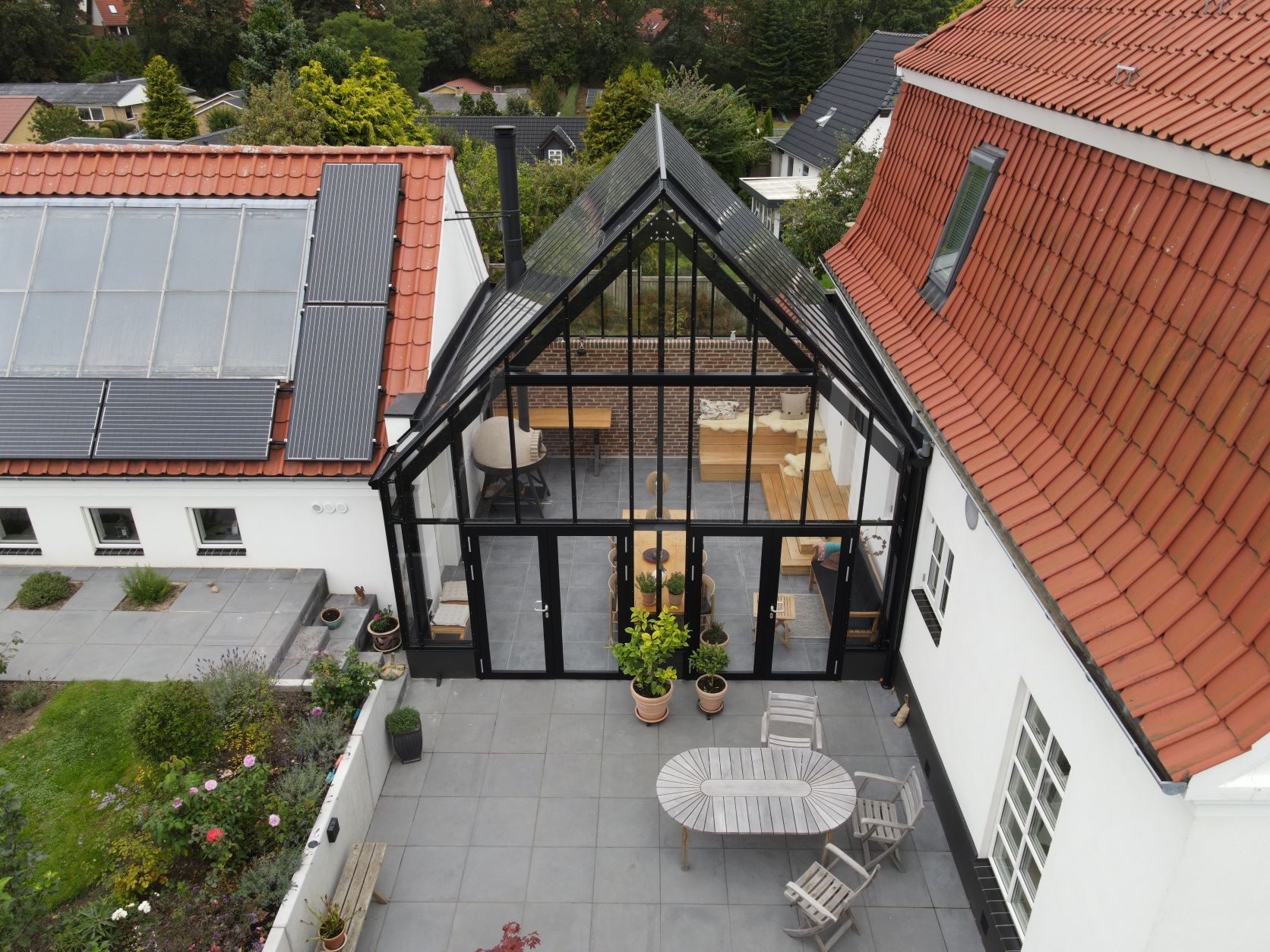 Orangeriet fungerer som en forlængelse af huset og er placeret i gårdrummet mellem villaen og garagen. For at sikre privatlivet er facaden mod vejen skærmet af en mur. Orangeriet er bygget som en tilbygning, der er forskudt i forhold til huset. For at skabe en sømløs forbindelse mellem orangeriet, terrassen og haven er der installeret to dobbelte døre, der åbner ud mod terrassen. Øverst i glasstrukturen sørger klimastyrede, automatiske vinduer for ventilation og luftcirkulation ved automatisk at åbne, når solen skaber varme.