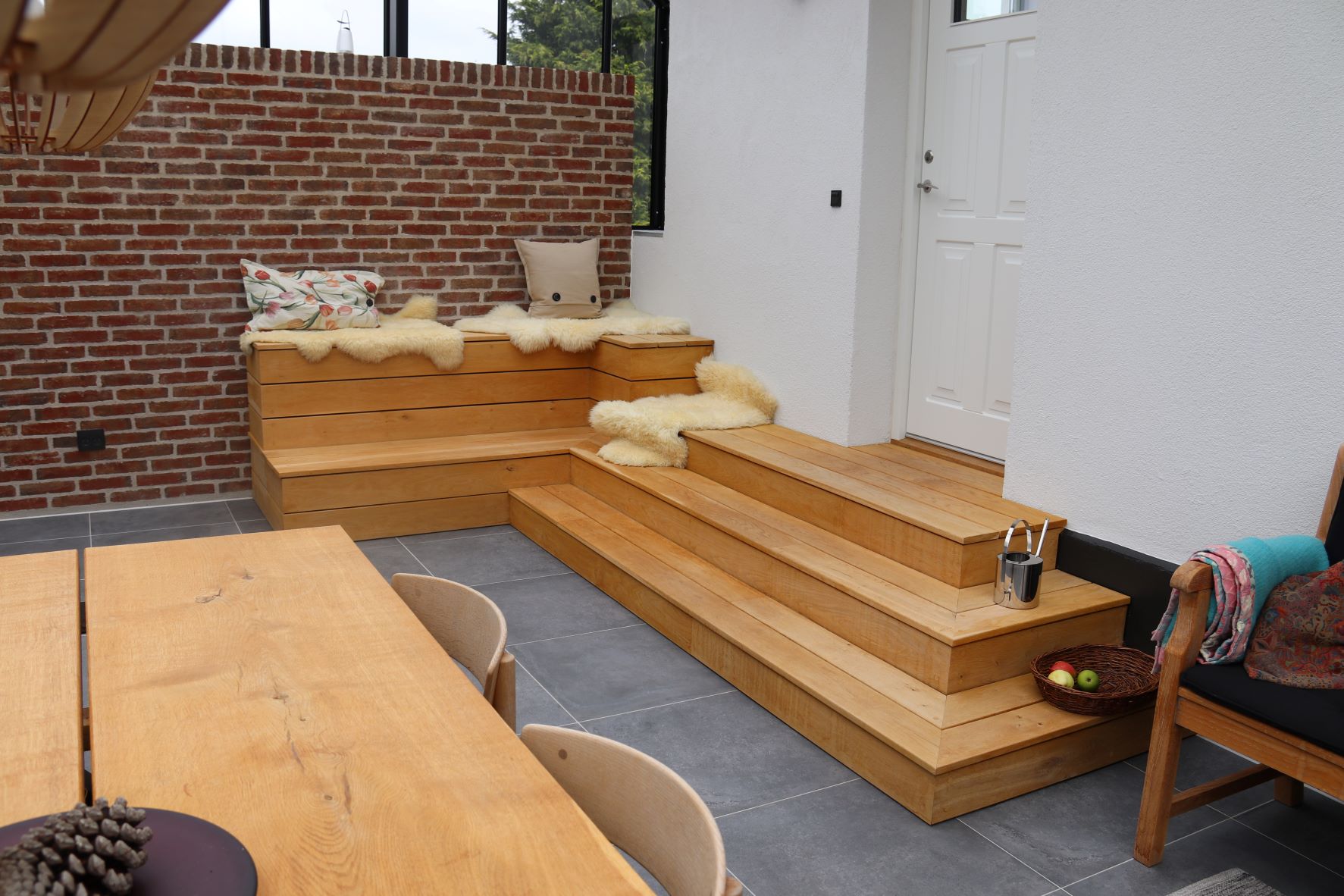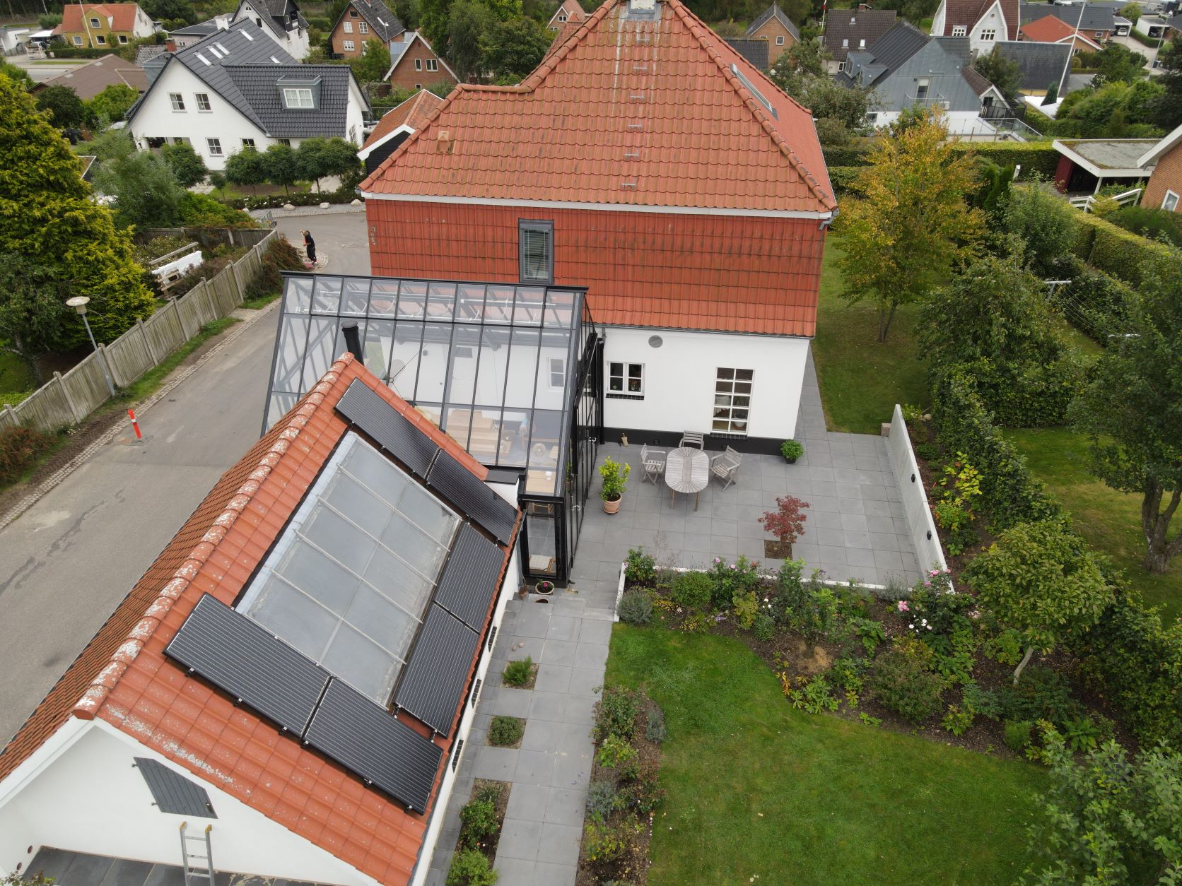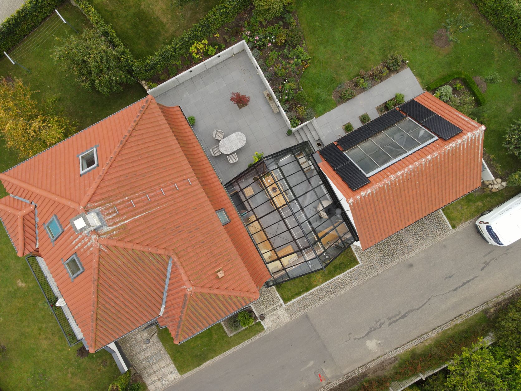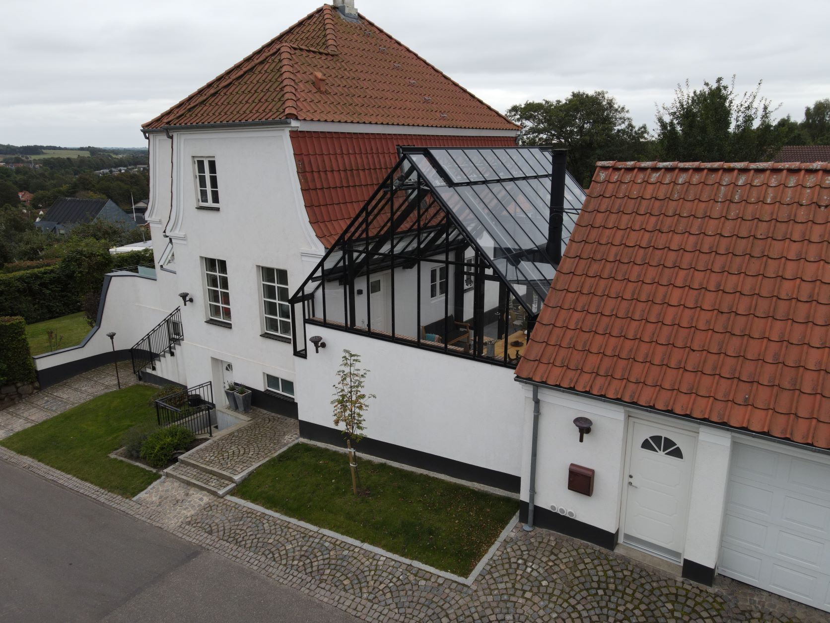 Orangeriet fungerer som en forlængelse af huset og er placeret i gårdrummet mellem villaen og garagen. For at sikre privatlivet er facaden mod vejen skærmet af en mur. Orangeriet er bygget som en tilbygning, der er forskudt i forhold til huset. For at skabe en sømløs forbindelse mellem orangeriet, terrassen og haven er der installeret to dobbelte døre, der åbner ud mod terrassen. Øverst i glasstrukturen sørger klimastyrede, automatiske vinduer for ventilation og luftcirkulation ved automatisk at åbne, når solen skaber varme.